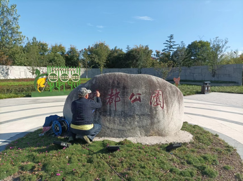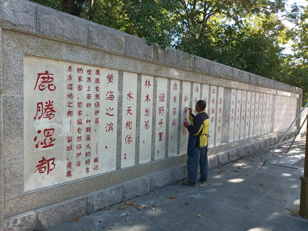 潤都公園主入口的特色浮雕景墻上嵌有“鶴舞東方”、“鹿騰濕都”等字樣,設(shè)計方案充分融入鹽城地方元素,以“鶴”、“鹿” 為主題,結(jié)合優(yōu)雅靈動的浮雕畫,突出鹽城濕地廣闊、物種豐富、生態(tài)良好的特點,充分體現(xiàn)了鹽城自然環(huán)境的優(yōu)越性。 美景共賞,更需要共同去維護。近日,公園工作人員對東門入口特色浮雕景墻和北門入口景觀石進行清洗打磨、破損修復(fù)、字樣出新等處理。翻新工作保護了經(jīng)自然侵蝕的磨損景觀,改變了長久以來暗淡的色彩,也提升了公園入口景觀效果。
